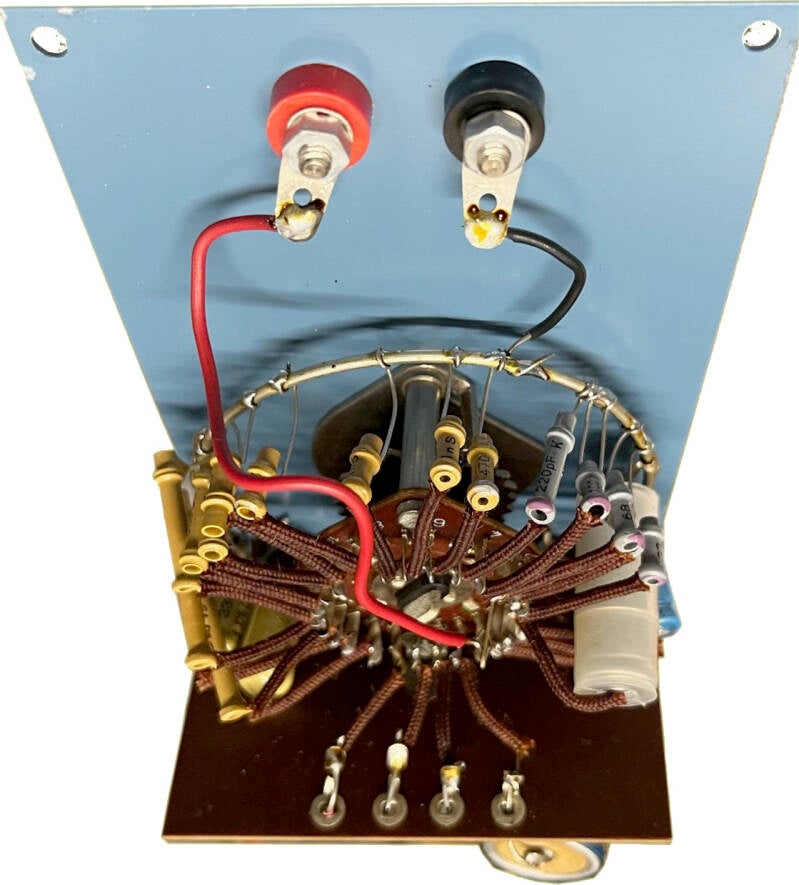 L’entreprise espagnole Retex S.A. de Barcelone propose ce kit en 1960. Il s’agit d’une boîte de substitution de condensateurs, utilisable pour le dépannage ou la mise au point de montages expérimentaux. Un contacteur à 26 positions commute des condensateurs dont la valeur s’échelonne entre 33pF et 100uF. La tension de service est de 400 à 500 volts pour l’ensemble des condensateurs, hormis les chimiques entre 6,4uF et 100uF qui ne supportent que 25 volts. Le condensateur de 16 uF / 500 V était défectueux. Il a été remplacé par deux condensateurs de 33uF / 400V placés en série et équilibré avec une résistance de 100kΩ. Les condensateurs Mullard (moutarde) sont conformes à leur réputation et donc en excellent état. Au total, cinq condensateurs ont été changés. Les autres se sont révélés très précis tels qu’en témoignent les quelques photos ci-dessous prises en exemple.