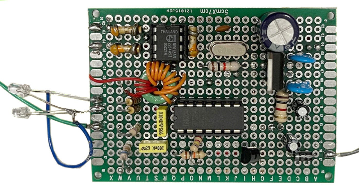 Montage d'essai du convertisseur. Remarquez le peu de composants nécessaire. La plaquette mesure 8 X 5 cm.