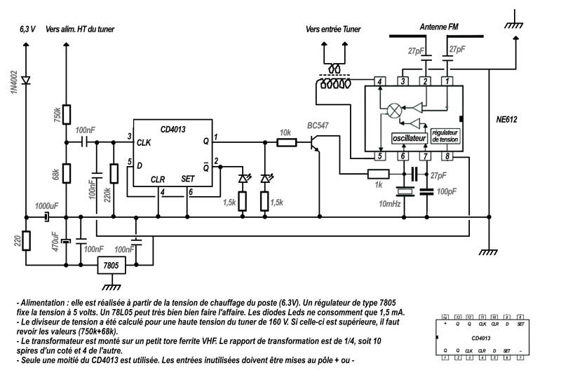 Ainsi, pour passer de 87,5-100 mHz à 100-108 mHz, il suffit de revenir en AM, puis à nouveau en FM. A chaque changement le circuit est alternativement commuté soit sur le haut, soit sur le bas de la bande FM. Deux leds de couleur indiquent en face avant la gamme en fonction.