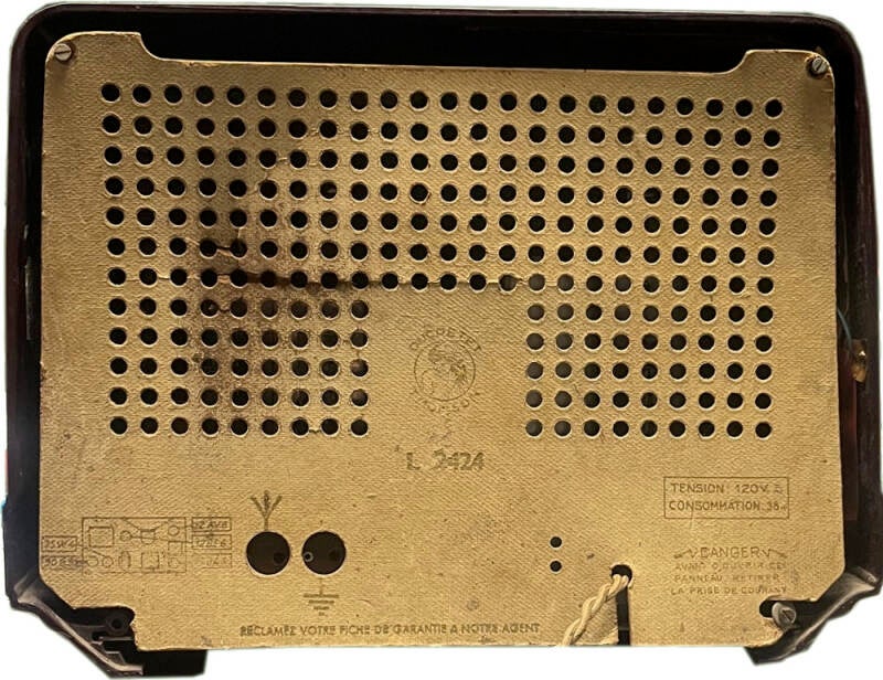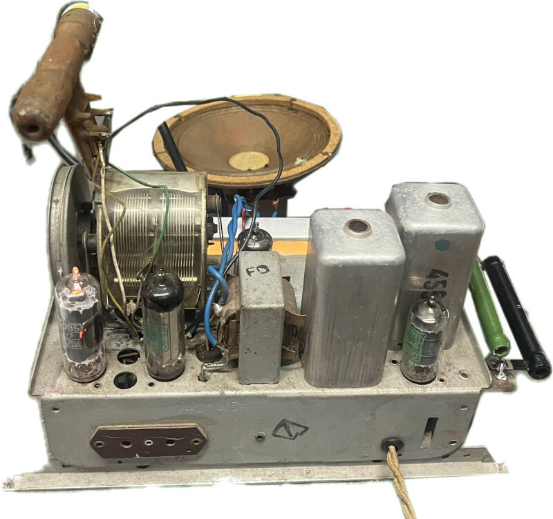 Récupéré dans un état très sale il a fallu commencer avant tout par un nettoyage en profondeur. Les condensateurs chimiques et papiers ont été remplacés. Le tube changeur de fréquence 12BE6, était absent. Le tube de puissance BF, 50B5, avait son filament coupé. La résistance chutrice de 1250Ω en série avec les lampes de cadran était coupée. N’ayant pas la valeur exacte pour son remplacement, j’ai monté deux résistances en série. Le cordon secteur et plusieurs fils de câblage ont dû être remplacés. Enfin, le tissu tâché et déchiré de la face avant a été remplacé par un modèle approchant.