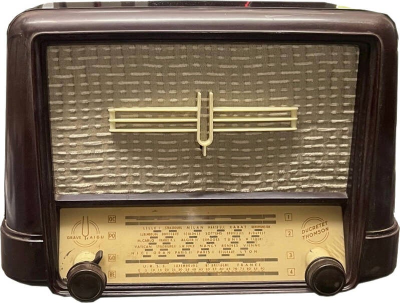 Le poste DUCRETET-THOMSON L2424 construit en 1954, est équipé de cinq lampes miniatures dont les filaments sont branchés en série. Sa tension d’alimentation est de 110 à 130 volts en courant continu ou alternatif. Le bloc d’accord permet la réception des GO, PO, OC et BE. Il possède une antenne cadre ferrite qui le dispense d’antenne extérieure pour la réception des GO et PO. Le câblage est très serré et certains composants ne sont accessibles seulement après en avoir dessoudé d’autres. Sa taille modeste (29x22x16 cm) le positionne parmi les postes dits « de chevet ».