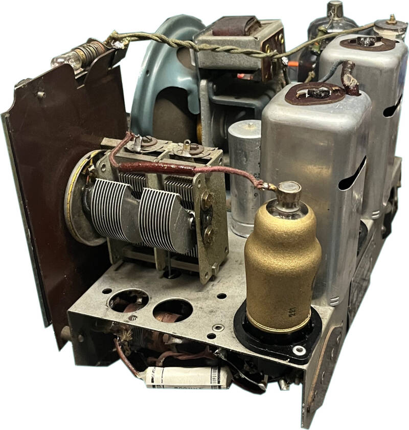 Remise en fonction : La ficelle d’entrainement du CV est cassée et doit être remplacée. Les condensateurs papiers et chimiques sont changés avant de procéder à la mise sous tension. Seul la BF fonctionne mais le poste reste muet malgré l’injection d’un signal modulé de 472 kHz sur le second transfo MF. Un faible signal est perceptible en réglant le générateur sur 800 kHz. En cause, les condensateurs mica des transfos MF qui sont HS. Les condensateurs sont remplacés sur les deux transfos et l’alignement est cette fois possible sur 472 kHz. Aucune réception toutefois en PO. C’est un autre condensateur mica sur le bloc d’accord qui ne fait que 200pF au lieu de 280pF. Son remplacement résout le problème. Les condensateurs au mica vieillissent généralement très bien à l’exception de ceux possédant des rivets... Le poste fonctionnent correctement en PO et GO, moins bien en OC. Dans cette gamme, aucun réglage n’est possible sur le bloc d’accord et les dérives dues au vieillissement des composants ne sont pas rattrapables.