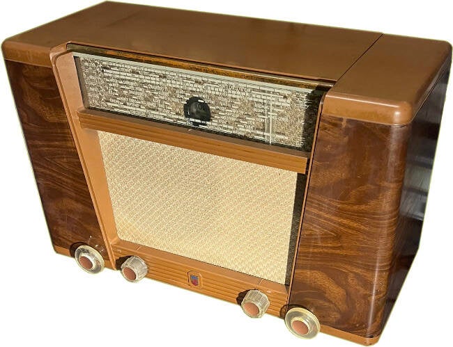 Commercialisé en 1950, le Philips BF401A est un poste de table comprenant 6 lampes de la série « Rimlock ». Il reçoit grandes ondes, petites ondes, ondes courtes de 5.88 à 18,75 mHz, et une bande étalée de 5,95 à 6,38 mHz. Il dispose de quatre boutons rotatifs en façade qui assurent la commande de tonalité et la commutation PU, la mise en marche et le volume, la commutation des quatre gammes, la recherche des stations. Le boitier est en bakélite, imitation bois. Avant de procéder aux premiers essais, il a fallu remplacer les condensateurs chimiques et papiers, le cordon secteur, une résistance bobinée et la valve UY41 défaillante. Ceci fait, le poste fonctionne mais la qualité sonore est médiocre, notamment dans les basses. En cause, le haut parleur dont la membrane est dégradée et partiellement déchirée. J’ai tenté de la restaurer mais sans succès. Le haut-parleur est donc remplacé par un autre modèle. La BF est à présent correcte. Pour finir, j’ai ajouté au poste un module Bluetooth qui est actif sur la position « PU »