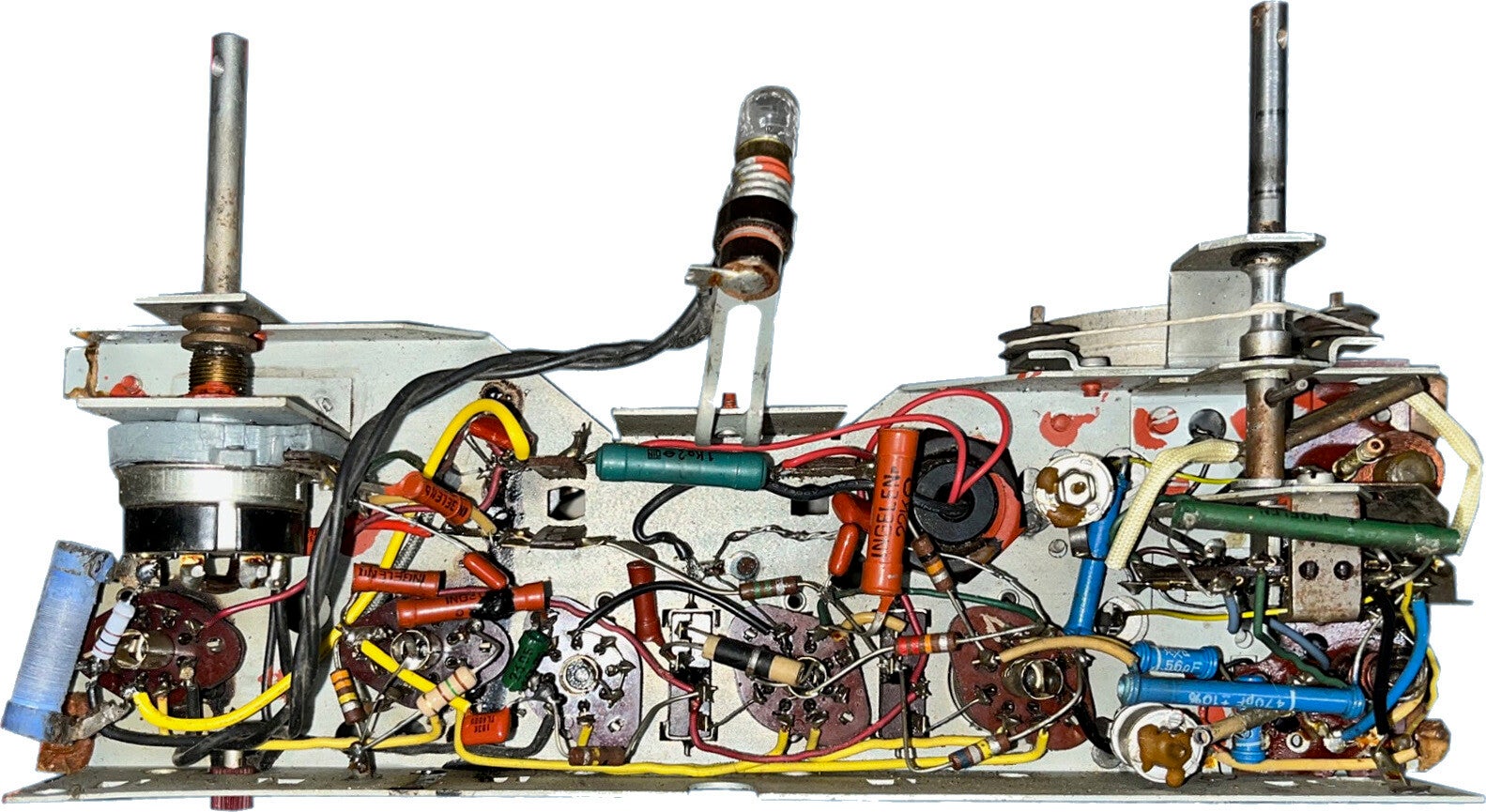 Ce poste était la propriété d’un autre passionné qui en avait débuté la restauration. Il ne me reste donc qu’à finaliser le travail. Soit, insérer les condensateurs de filtrage dans l’ancien contenant, puis procéder aux essais (sous 110 volts car il manque la résistance chutrice permettant l’alimentation sur des tensions supérieures). La réception en GO et PO est correcte mais rien en OC. Un condensateur dans le circuit HF n’avait pas encore été remplacé et cela empêchait le bon fonctionnement de cette gamme. Les OC sont revenues mais les oscillations sont faibles et décrochent en bout de bande. Le remplacement de la lampe UCH42 résout le problème.