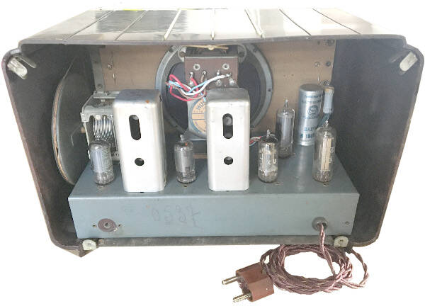 Ce poste de chevet date de 1950. Il est équipé de 5 lampes miniatures dont les filaments sont reliés en série pour permettre l’alimentation en 110 volts. Le haut-parleur est à excitation. Sa bobine est connectée en parallèle sur la haute tension. Le poste reçoit grandes ondes, petites ondes et ondes courtes. Le raccordement d’une antenne extérieure est impératif. La MF est réglée sur 455 kHz.