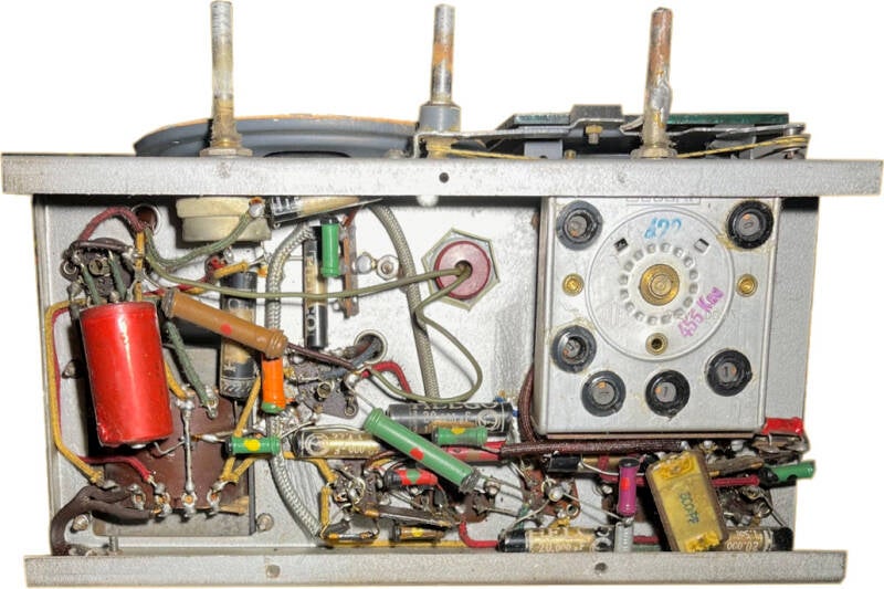 Ce petit poste large de seulement 35 cm, produit en 1951 par la société française LG, utilise le jeu de lampes miniatures suivant : 6BE6 – 6BA6 – 6AT6 -6AQ5 – 6X4. Le bloc d’accord de marque « Sécurit » permet la réception des GO, PO et OC. Deux modèles identiques ont été produits : le 51, poste tous courants alimentés en 110 volts, et le modèle 52 équipé d’un transformateur d’alimentation commutable de 110 à 245 volts. Le raccordement d’une antenne extérieure est nécessaire pour la réception des stations. Les transformateurs de moyenne fréquence sont réglés sur 455 kHz. La sensibilité du récepteur est bonne et la qualité BF correcte. Remise en route effectuée sans problème après changement du cordon d’alimentation secteur et des condensateurs papiers et chimiques. Petit poste au look sympathique !
