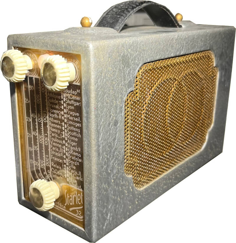 Le « Statlett 32 » de la marque Radio Star est commercialisé en 1949. Il s’agit d’un poste miniature, tous courants, conçu autour de cinq lampes de la série Rimlock : UCH42, UF41, UBC41, UL41, UY41. Il comprend quatre gammes d’ondes : GO, PO, 2x OC. Ses dimensions réduites (8 x 14 x 21 cm), imposent un câblage extrêmement serré où ne subsiste que peu de place libre. Plusieurs composants sont soudés directement entre eux en se passant de cosses relais. A noter que la prise PU et HP n’est ni plus ni moins qu’un support de lampe octal. Le fabricant proposait en supplément un bouchon pour le raccordement sur secteur 220v, ainsi qu’un convertisseur 6/110v ou 12/110v permettant l’utilisation à bord d’un véhicule. Le raccordement d’une antenne extérieure est indispensable au fonctionnement du poste.