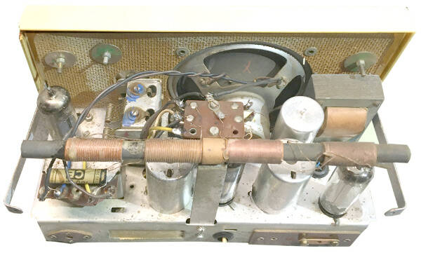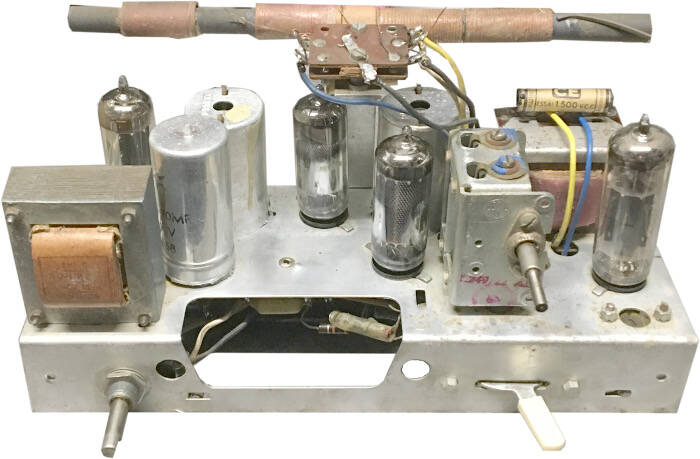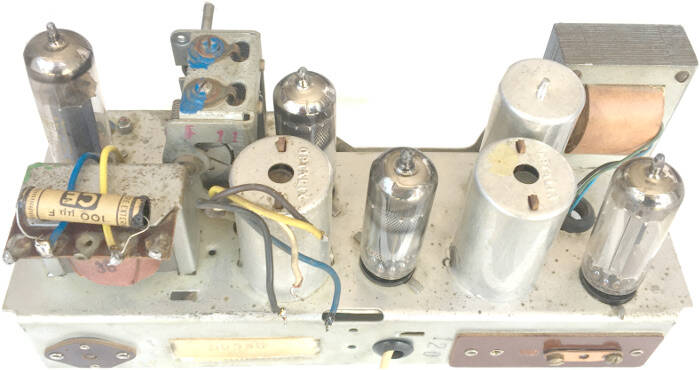 Ce petit poste de chevet date de 1956. Il est équipé de 4 lampes de type noval, série « U ». Un autotransformateur permet de choisir une tension alternative d’alimentation de 110 ou 220 volts. Il est prévu pour capter grandes et petites ondes. La moyenne fréquence est fixée à 455 kHz. Une antenne sur cadre ferrite assure la collecte des ondes. Après un nettoyage complet, le remplacement des condensateurs papiers et chimiques le poste est toujours muet. La BF est présente. Quelques mesures m’indiquent une coupure dans le deuxième transformateur MF. Rien de grave et le transfo est récupérable. Le transfo remonté, le poste fonctionne à nouveau.