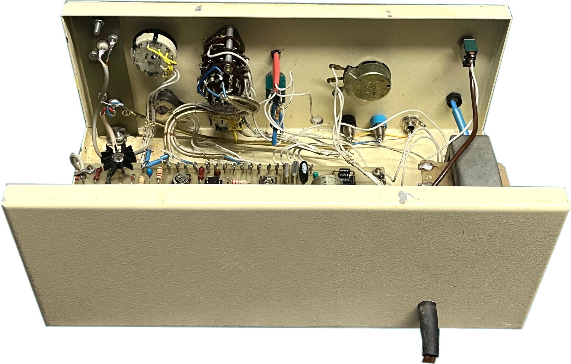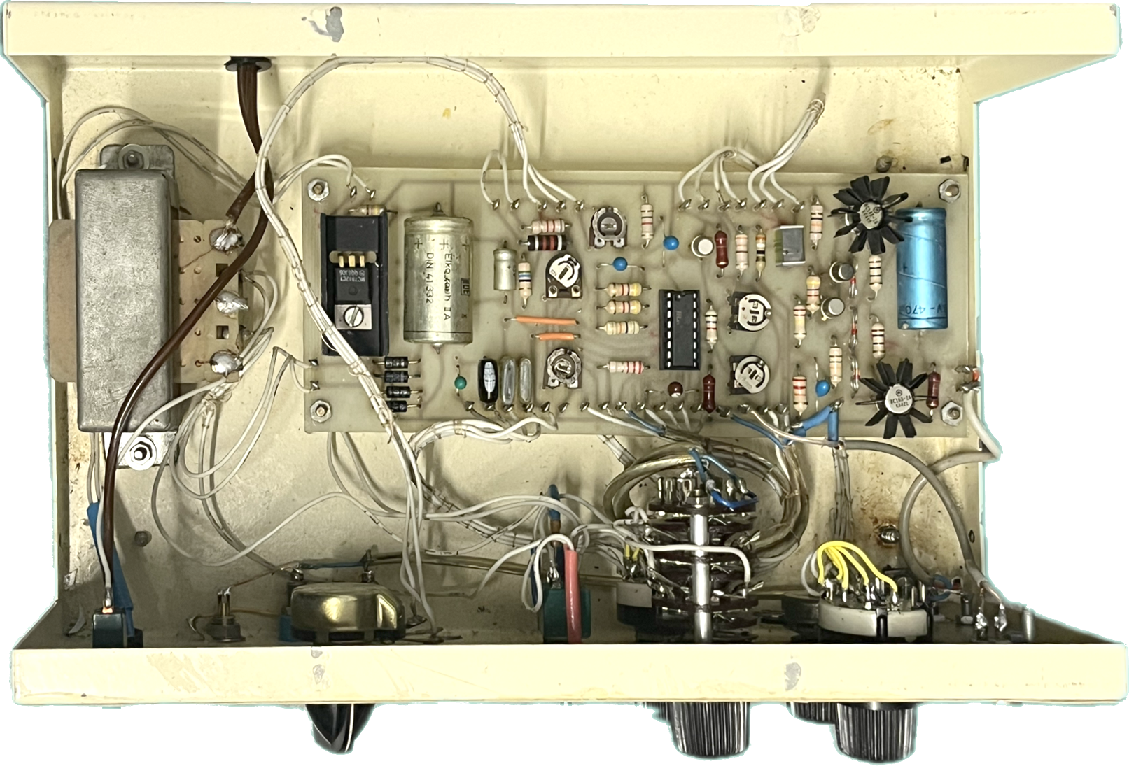 Générateur BF réalisé dans les années 80 à partir d’une description parue dans la revue Elektor de juin 78. Il est conçu autour du célèbre circuit XR2206. La fréquence est réglable de 10 Hz à 220 KHz. Un potentiomètre gradué de 10 à 110 et un commutateur à 4 positions sont utilisés pour le choix de la fréquence : 10 à 110 Hz, 100 à 1100 Hz, 1 à 11 kHz, 10 à 110 kHz. Un interrupteur multiplie la fréquence affichée par 2. Le circuit fournit cinq formes de signaux : carré, sinus, triangulaire, dent de scie et impulsion. Il dispose de trois gammes calibrées de tension de sortie : 0 à 10 mV – 0 à 100 mV – 0 à 1 V (efficace). La précision des indications est très satisfaisante. L’étage de sortie construit autour de transistors complémentaires a une impédance de sortie de 5 Ω, ce qui permet de raccorder directement un haut-parleur. La sortie, protégée contre les courts-circuits, est disponible sur fiches bananes, BNC ou RCA (cinch). Le générateur dispose d’une sortie de niveau TTL (5V).
