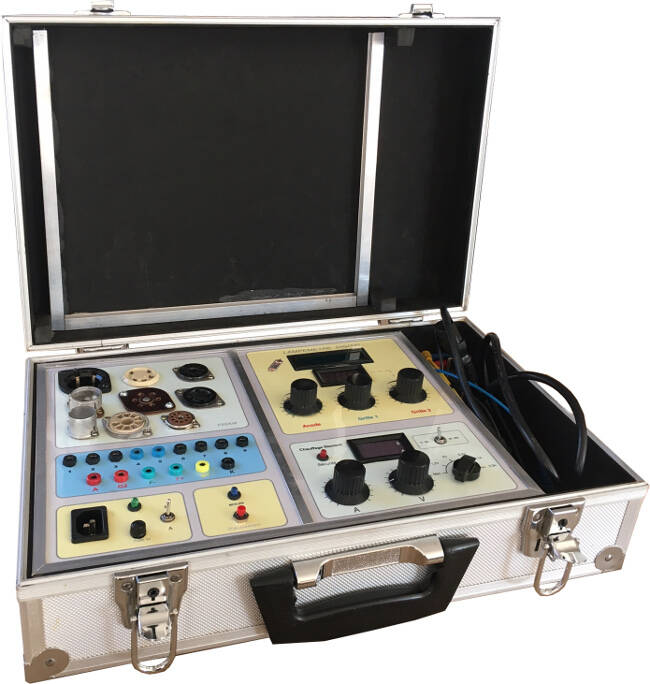 Le lampemètre ci-après a été réalisé à partir d’un kit d’Alain Ducrocq (site radioelec.com). Les mesures sont effectuées en mode impulsionnel ce qui est sans aucun danger pour les tubes testées. La tension maximum d’anode peut être réglée à 450 volts maximum. Le kit est complété par une alimentation HT variable afin d’effectuer des mesures en mode tétrode ou penthode. Le chauffage des filaments est réalisé à partir d’un kit d’alimentation de 0 à 30 volts, commutable en série avec une alimentation fixe de 30v. Ainsi, la tension de chauffage est réglable de 0 à 30 volts ou de 30 à 60 volts. Des préréglages de tensions et intensités permettent de sélectionner les valeurs courantes utilisées pour le chauffage des lampes. Le choix d’un matrice avec fiches bananes plutôt que de multiples commutateurs, simplifie le montage. L’ensemble est intégré dans une valisette en aluminium.